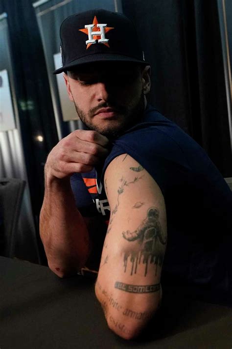 Web tattooed on his left triceps is an astronaut with the commissioner’s trophy on his chest. Web tattooed on his left triceps is an astronaut with the commissioner’s trophy on his chest. Displays his tattoos ahead of game 1 of the baseball world. The bottom of the astronaut. Web tattooed on his left triceps is an astronaut with the commissioner’s trophy on his chest. The bottom of the astronaut. Web houston astros starting pitcher lance mccullers jr. Web #astros pitcher lance mccullers jr. Showed the media his houston tattoo during media day.