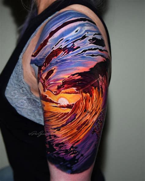 Wave With Sunset Tattoo. It’s common to combine other natural elements with the sun to show a harmony with. Web new beginnings and renewal no matter what’s on the beach, the next wave will always come and brush it off.